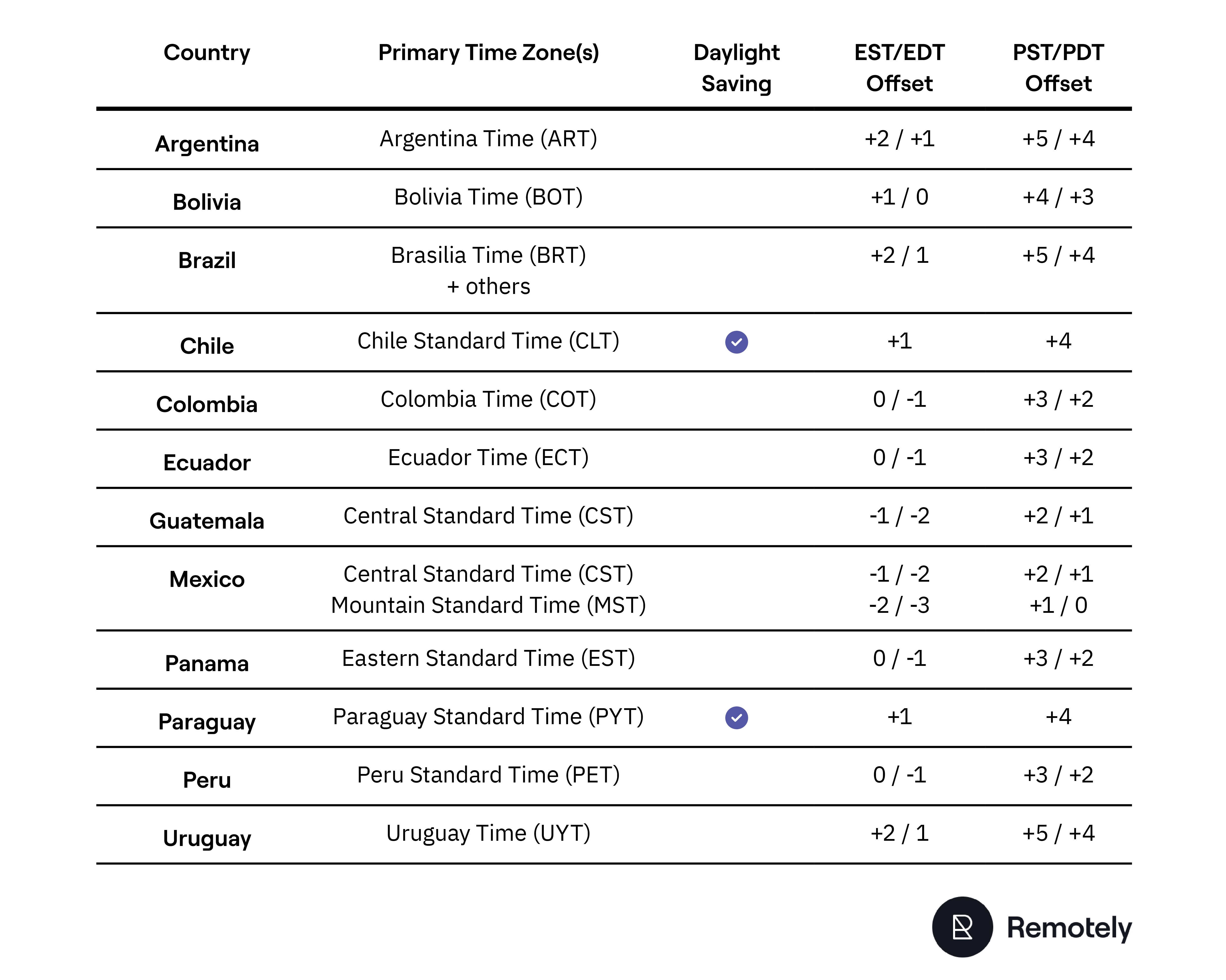 The table below maps every major LATAM country to its UTC offset and shows how many working hours overlap with US Eastern and Pacific time zones.